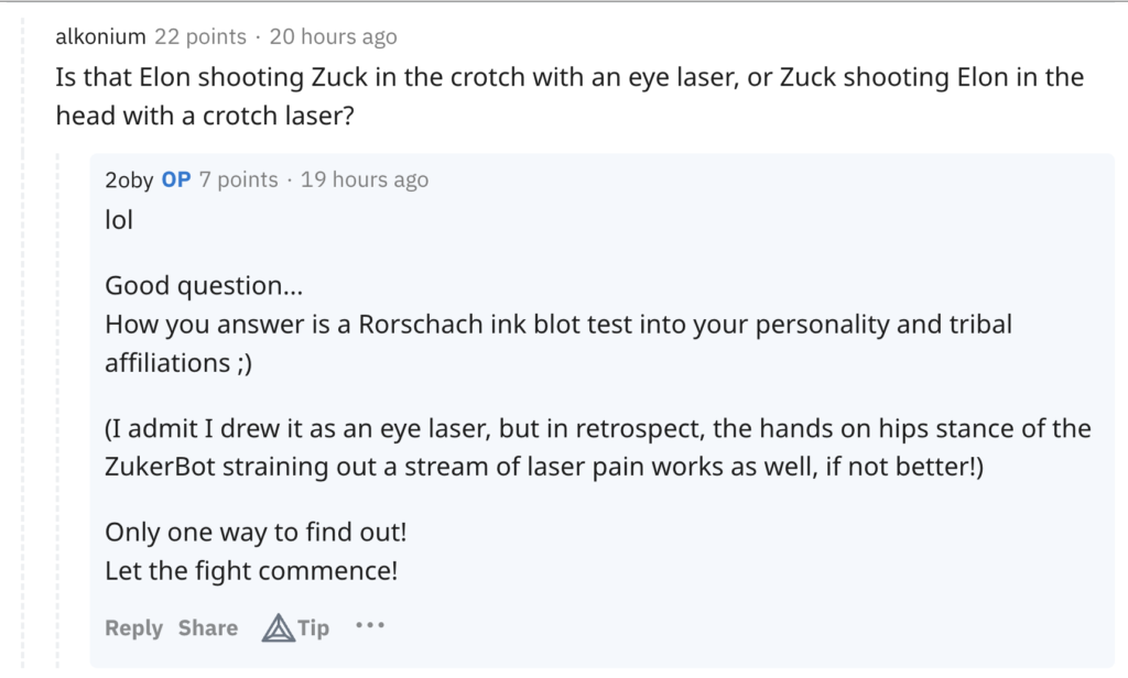 Fight! June 23, 2023 Illustration (AI Collab) of a giant ‘Gundam Style’ robot battle between Elon and Zuk.